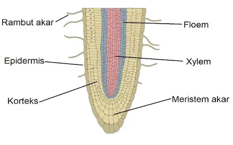 Tudung akar tumbuhan berada di bagian paling ujung dan berfungsi melindungi jaringan muda agar tidak rusak ketika menembus tanah. Di atasnya terdapat jaringan meristem yang aktif membelah untuk pertumbuhan akar baru. Semakin ke atas, terdapat zona diferensiasi di mana sel-sel mulai mengalami perubahan bentuk dan fungsi, salah satunya membentuk rambut akar.